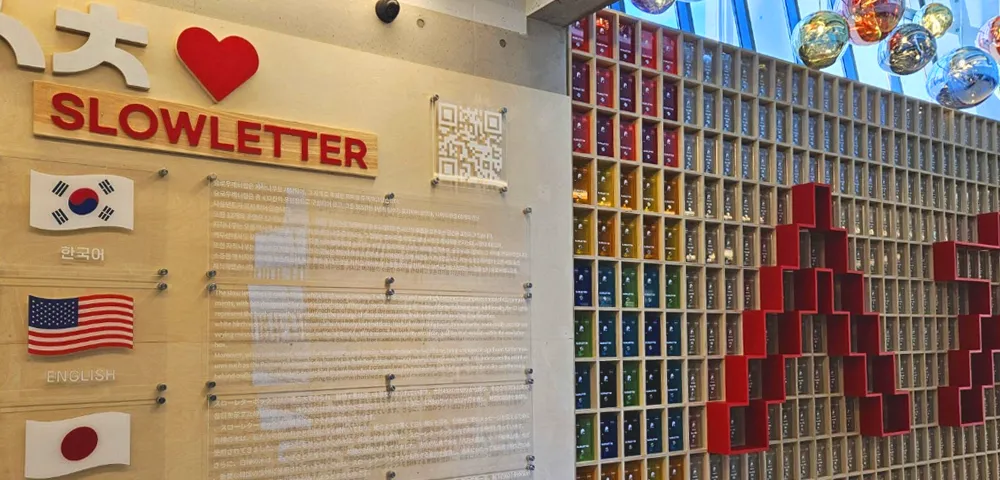 자작나무로 만들어진, 총 432칸의 우편함으로 이루어진 슬로우레터